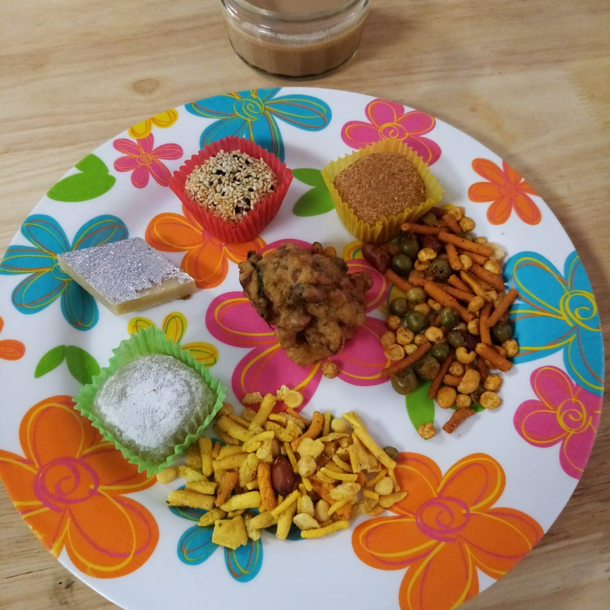 We returned with an assortment of Bombay Mix, Gujarati Mix, Japanese Mochi, and Kaju Katli — a feast of colors and textures. Mark added some biscuits, and Anita delighted everyone with homemade pakoras.